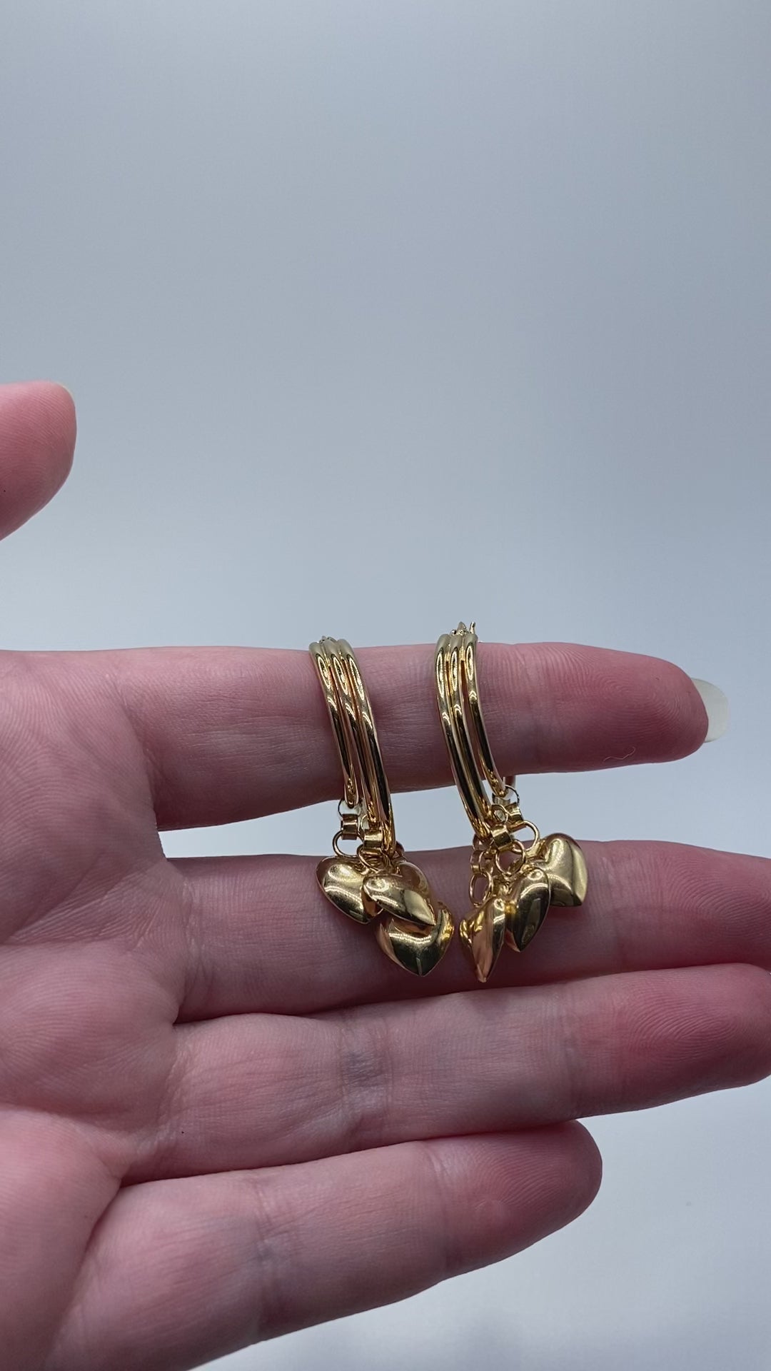 Triple the (heart) charm on these lovely, fun dangle hoop earrings! Crafted in 14k yellow gold, with wonderful movement of the heart charms, these hoops are sure to enchant.
