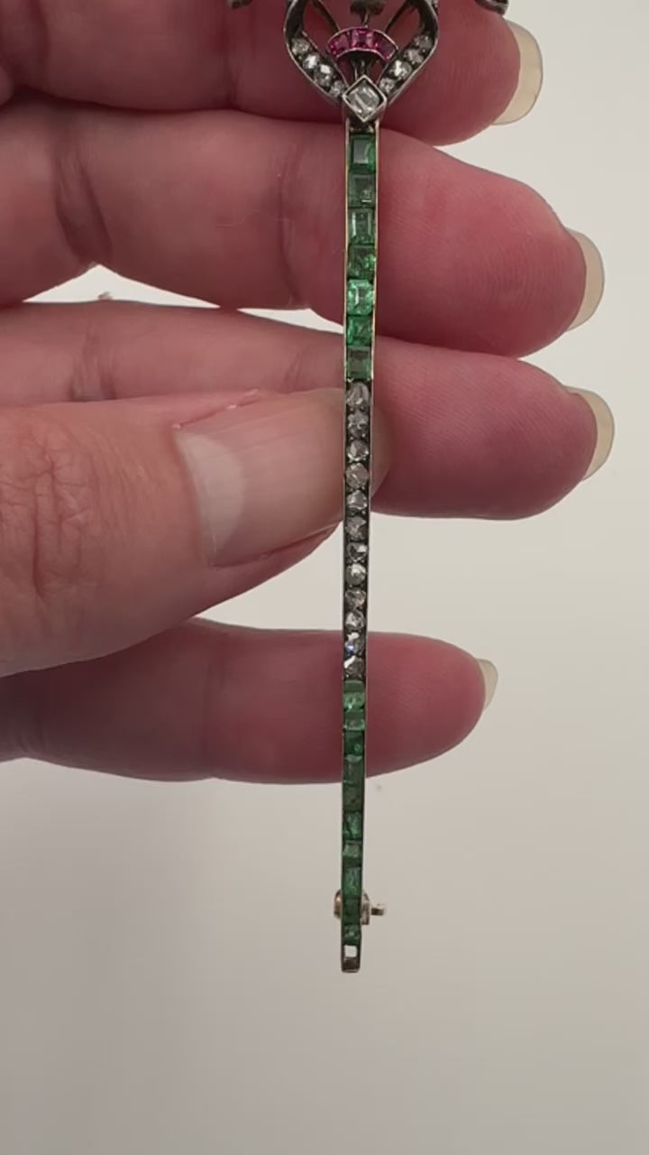 Indulge in luxury with our Antique 14k Silver Diamond Emerald Ruby Brooch. Adorned with dazzling diamonds, vibrant emeralds, and rich rubies, this long brooch is reminiscent of a key, unlocking the secrets of elegance and sophistication. Crafted in 14k yellow/ rosy gold and silver, it is a true treasure for the ages.