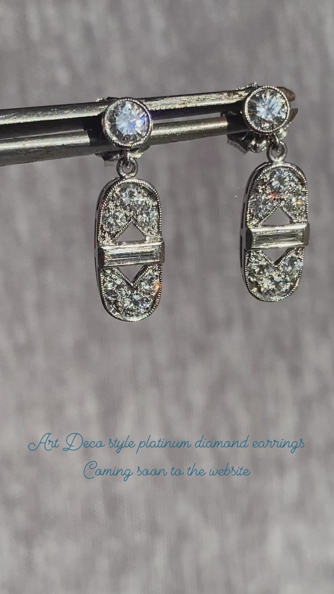 Such a great pair of Art Deco style platinum diamond drop earrings! These sweet earrings feature approximately 1 ct total weight of diamonds, with a combination of round brilliant cuts and baguettes. The milgrain detail adds a nice design element to these lovelies.